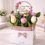 Includes: 8 wax melt flowers a mix of Roses, Tulips and Peonies in a Black Ice and Pink Sands scent, Greenery fillers, 1 Mother's Floral Decor, Decorative box and Ribbon