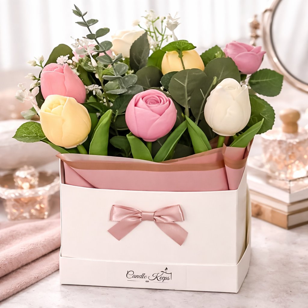 Includes: 8 wax melt flowers a mix of Roses, Tulips and Peonies in a Black Ice and Pink Sands scent, Greenery fillers, Decorative box and Ribbon